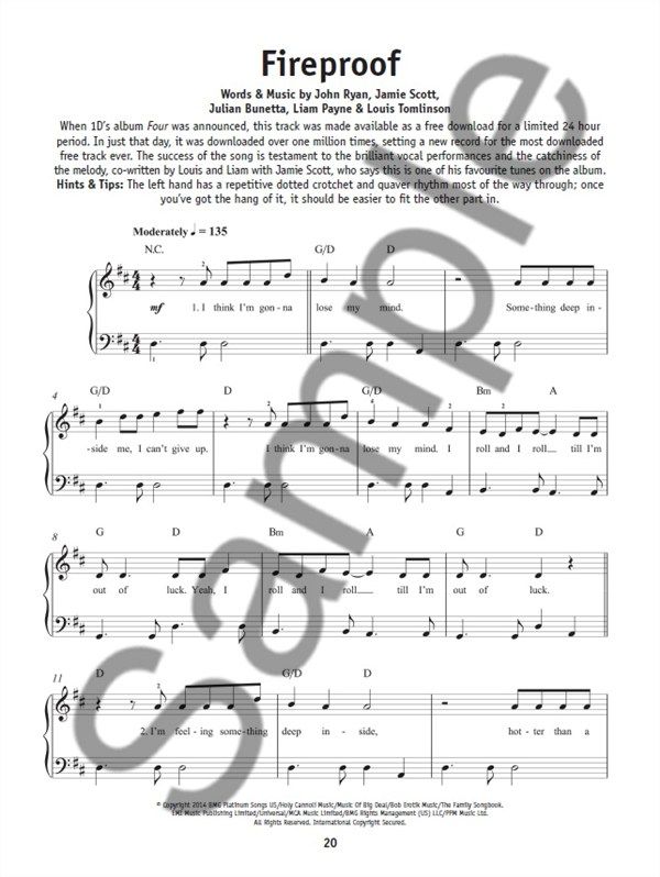 This edition of the Really Easy Piano series is a bumper collection of 37 of the best One Direction songs from their massive career to date. All arranged for Easy Piano with simplified fingerings, each song also comes with some interesting background information and performance hints and tips for perfect Piano playing. Featuring all of the band's best tunes, The Big One Direction Songbook includes songs like Best Song Ever, Fireproof, Live While We're Young, Midnight Memories and Story Of My Life. Spanning their entire career to date, these songs represent the development of possibly the world's biggest pop band. Their earlier upbeat tunes are included here, as well as their more intimate, personal and reflective songs from their more recent albums. This is the perfect One Direction sheet music songbook for any beginning pianist who loves the sounds of Harry, Zayn, Louis, Liam and Niall. Every one of these 37 songs is accurately and lovingly transcribed for Easy Piano, with simplified arrangements that retain the heart and power of each song. Simple guides to fingering are included, helping you to get those fingers into place, while there are also chord symbols and full lyrics, letting you play along exactly to how the song sounds. Not only this, but some fascinating background information on the songs is included, as well as really useful performance tips to help you hit those right notes first time. Taking songs from their first four albums, this songbook is a huge collection of the best and most popular One Direction songs on the airwaves right now. Since bursting onto the scene after an untimely exit from the X Factor, the five lads from humble backgrounds have become one of the biggest and most popular bands ever, breaking all kinds of records. Their success is here to stay, and this edition of Really Easy Piano allows pianists of all abilities to learn and play a massive 37 of their biggest hits so far. If you're a serious One Directioner or you just have a leaning towards simply great pop music, this Big One Direction Songbook is definitely for you. With 37 songs arranged for Easy Piano, you'll be playing all of their ridiculously catchy tunes in absolutely no time at all.