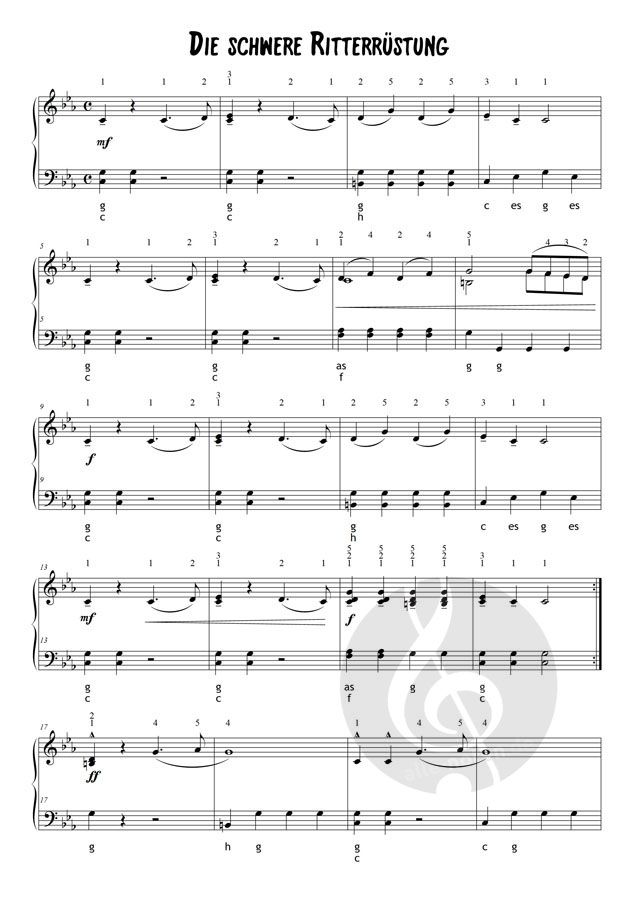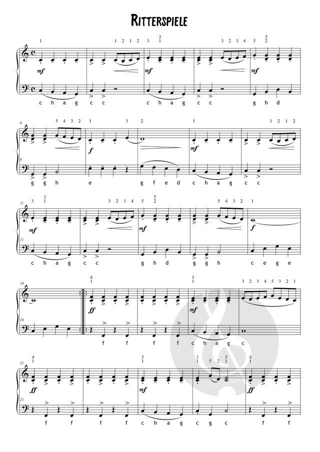 10 Geschichten rund um das Leben der Ritter, Burgfräulein und Burgherren für Klavier Solo im leichten bis mittleren Schwierigkeitsgrad.