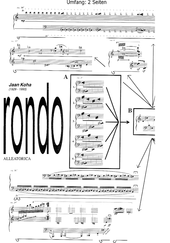 Dieses RONDO (1967 komponiert) ist eines der ersten aleatorischen Werke der estnischen Musik. Sein Grundmaterial besteht aus 2 Segmenten, das eine trägt in seinen fünf Varianten die Entwicklung der Dynamik, im anderen findet man aber freie Rhythmik und freies Tempo.Eres Estonia Edition