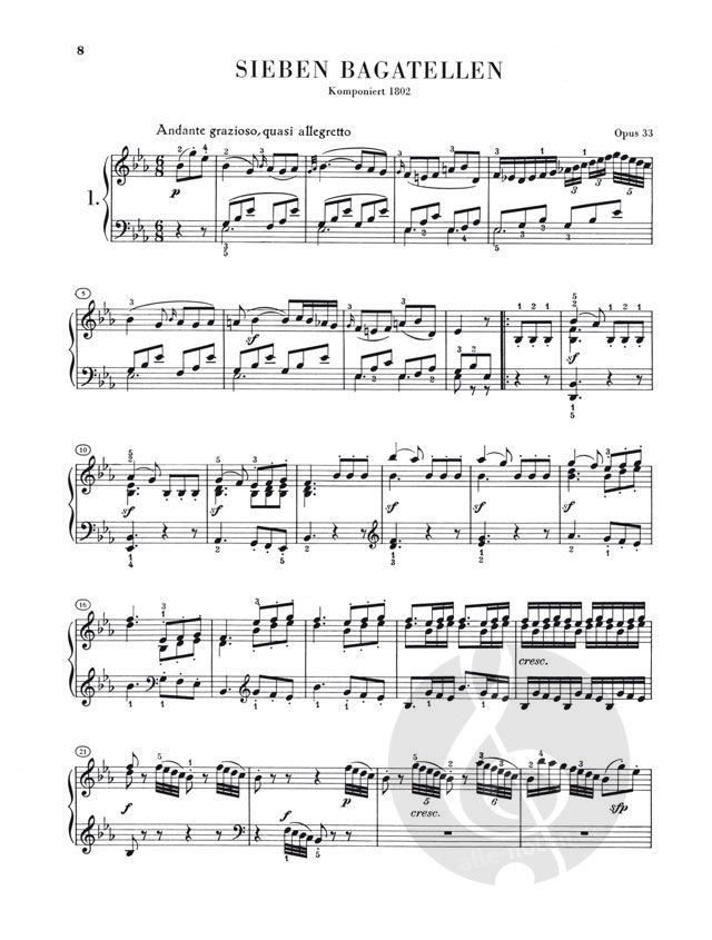 Ist von Beethovens Klaviermusik die Rede, so denkt man normalerweise in erster Linie an seine Klaviersonaten. Seine übrigen Kompositionen für dieses Instrument sind jedoch von keineswegs geringerer Bedeutung. So kommt es sicher nicht von ungefähr, dass er den größ-ten Teil seiner Bagatellen mit Opuszahl herausgab, was bei ihm in der Regel eine besondere Wertschätzung bedeutete. Sie repräsentieren die leichtere Seite dieses Komponisten, der allzu schnell als Meister des Schweren und Ernsten apostrophiert wird.