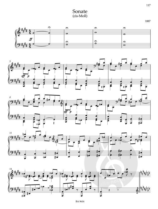 Nach dem 2009 erschienenen Band II (BA9617) mit den Sonaten Nr. 4 und 5 folgt nun Band I mit den chronologisch vorausgehenden Werken: Er umfasst neben den offiziell als Nr. 1 op. 6, Nr. 2 (Sonate-Fantaisie) op. 19 und Nr. 3 op. 23 zu Lebzeiten publizierten Sonaten auch die Jugendsonaten in gis-Moll (1886) und es-Moll (1887-89). Außerdem enthält die Ausgabe das nahezu unbekannte Fragment einer Sonate cis-Moll (1887) sowie die rekonstruierbaren Teile einer Sonate in gis-Moll (1892), die bislang noch nie ediert wurde.