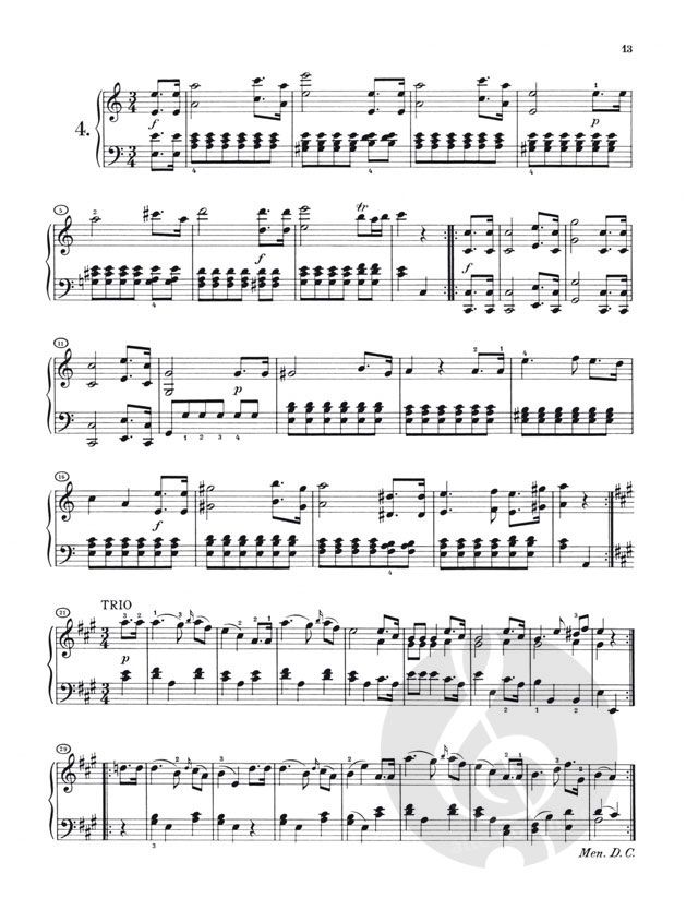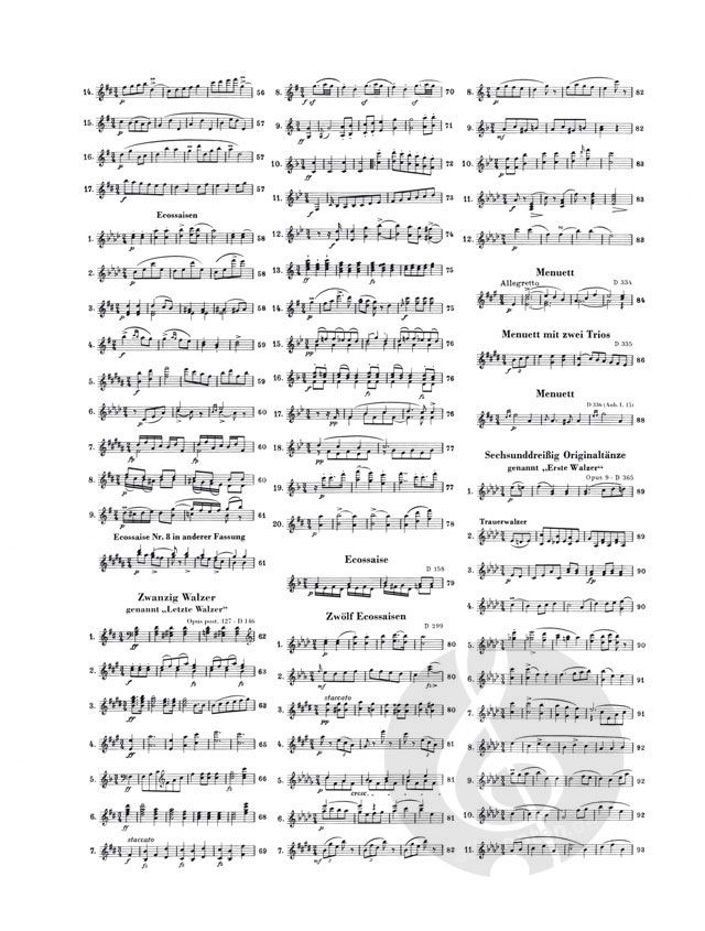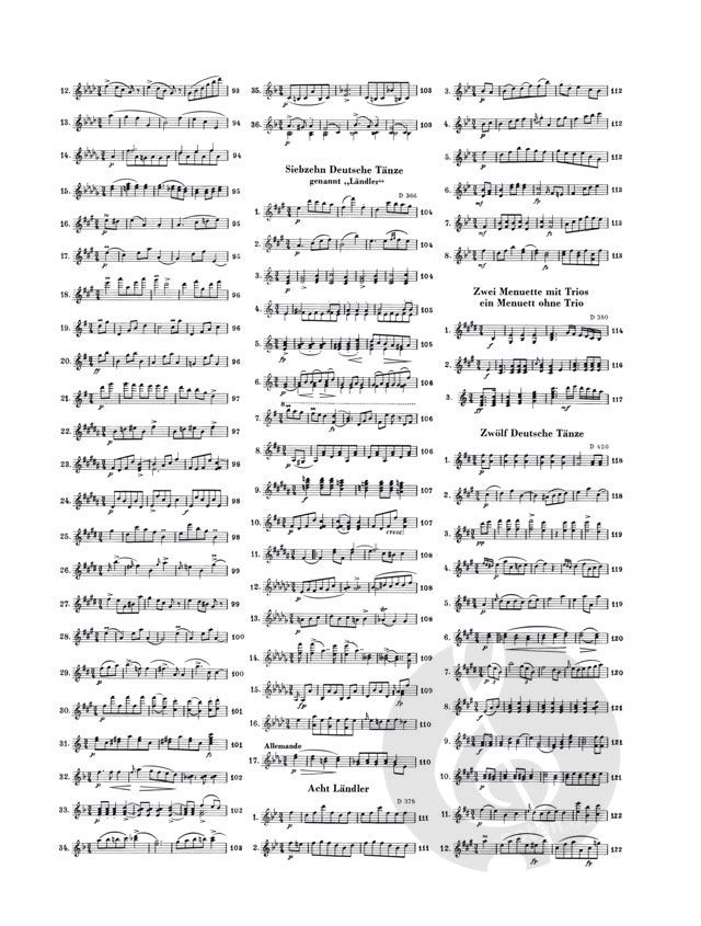 Schubert am Klavier, mit seinem unerschöpflichen Reichtum an Tanzmelodien, die Freunde um sich herum, tanzend und scherzend - dieses Bild gehört zu den gängigen Klischees, die man sich von diesem Komponisten macht. Der Ausdruck Schubertiaden, den man dafür ge-funden hat, ist zu einem festen Begriff geworden. Der Band enthält insgesamt 182 Tänze, Menuette, Walzer (darunter den berühmten 'Trauer-walzer', D 365 Nr. 2), Ländler, Ecossaisen, Deutsche - einer schöner als der andere. Die letz-ten aus diesem ersten Band komponierte Schubert 1816, also mit 19 Jahren (Bd. II siehe HN 76).