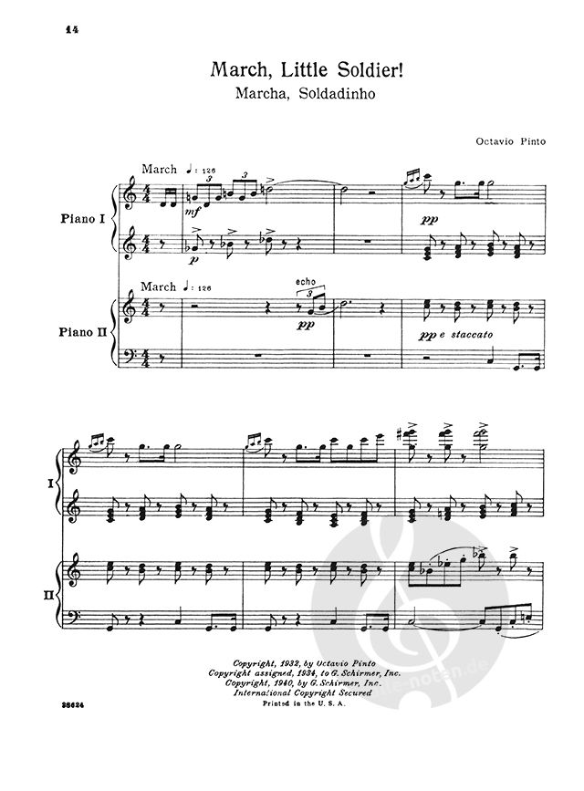 Two Pianos, Four Hands. 2 Copies needed to perform. Contents: Hobby-Horse - March, Little Soldier! - Ring Around the Rosy - Run, Run! - Sleeping Time.