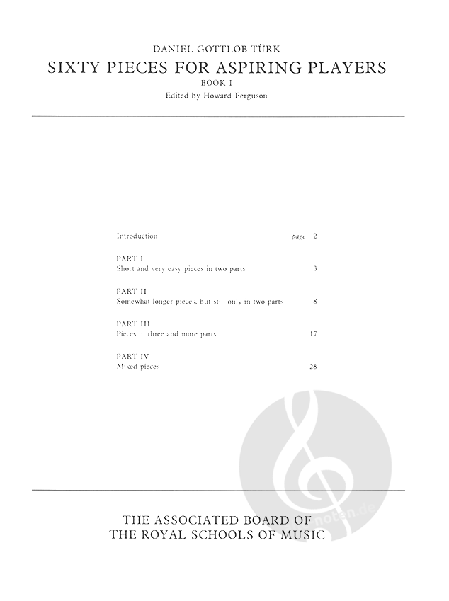 Daniel Gottlob Türk (1750-1813) who held the post of director of music at Halle University was responsible for the most influential keyboard tutor of its day the monumental Klavierschule. He also wrote these two books of practical pieces to accompany it. - progressing from the simplest two-part pieces to more complex works practising various aspects of technique the albums provide excellent teaching material for the early grades.