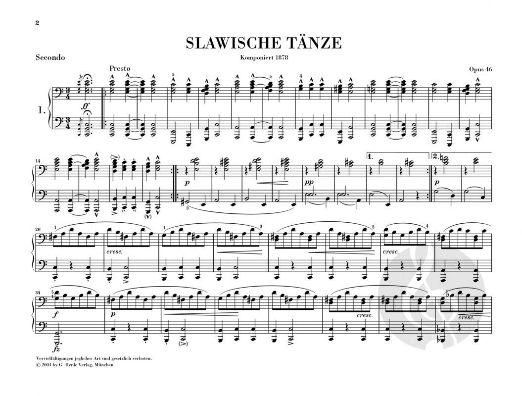 Mit Hinweis auf Brahms' 'Ungarische Tänze' wurde Dvorák 1878 beauftragt, Ähnliches in Anklang an seine Heimat zu schreiben. Die acht 'Slawischen Tänze', die daraufhin entstanden, verhalfen ihm zum internationalen Durchbruch. Furiant, Polka und Soudeská sind meisterhaft komponiert und verblüffen durch formales Raffinement. Die 'Slawischen Tänze' wurden auch in der Orchesterversion populär, waren jedoch zuerst für Klavier zu vier Händen geschrieben. Da der von Dvorák freigegebene Notentext keineswegs eine Idealversion war, präsentieren wir diese Fassung zu seinem 100. Todestag mit einem ausführlichen Kommentar zu Quellen und zu editorischen Problemen. Die beim vierhändigen Spiel oft heiklen Fingersätze sind hier in die Hände von Andreas Groethuysen gelegt, der seine Aufgabe praxisnah meistert.