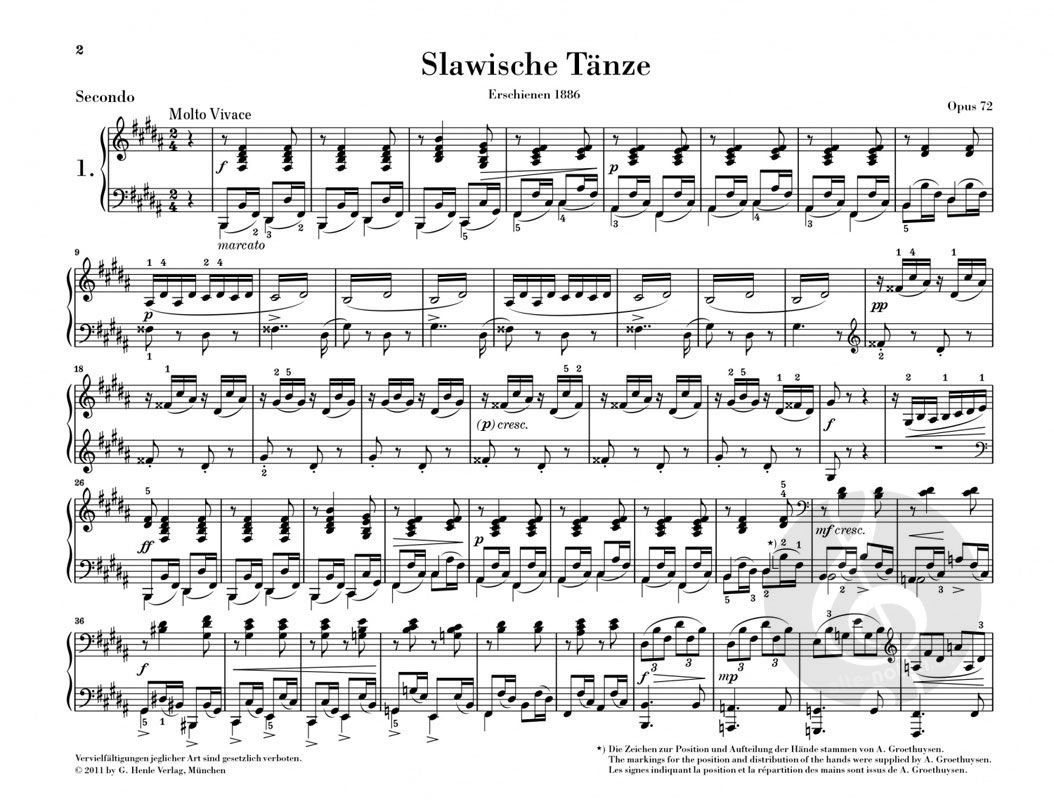 Mit Erscheinen des zweiten Bandes sind nun die 'Slawischen Tänze' vollständig im Urtext lieferbar. Nach dem großen Erfolg der ersten Reihe op. 46, die den Komponisten mit einem Schlag in aller Welt berühmt machte, drängte der Verleger auf Fortsetzung. Erst acht Jahre später machte sich Dvo?ák ans Werk, kündigte aber an, 'ich glaube, diese werden ganz anders'. Tatsächlich ist der Unterschied nicht zu überhören: größere formale Freiheit und farbenreichere Harmonik zeichnen die zweite Reihe aus. Ist Opus 46 vor allem von überbordender Lebensfreude geprägt (HN757), so werden hier in Opus 72 auch leisere Töne angeschlagen: Melancholie und Poesie halten Einzug in die Welt des ausgelassenen Tanzes.