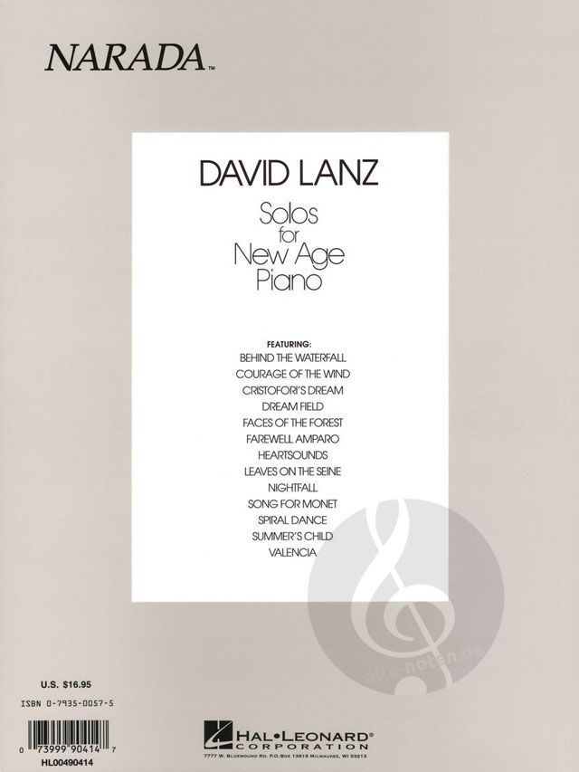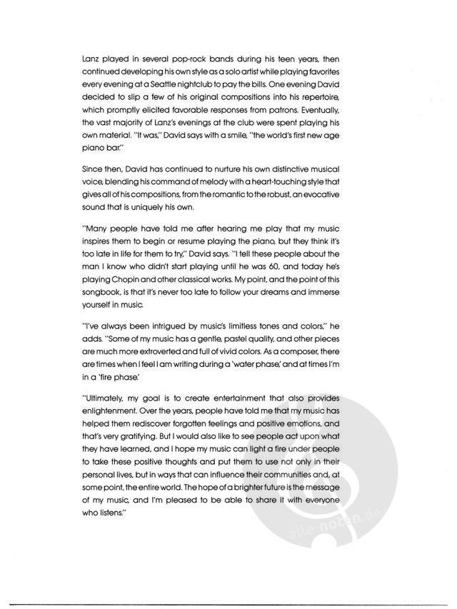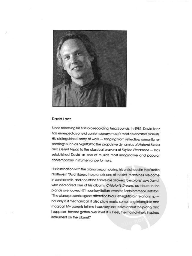Since releasing his first solo recording in 1983, David Lanz has emerged as one of contemporary music's most celebrated pianists. This collection provides 14 of his most celebrated pieces from five of his albums including Heartsounds, Nightfall, Cristofori's Dream, Natural States and Solstice. Also includes biography.