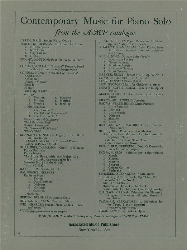 Sonatina For Piano (1949) is a work for solo Piano, scored in three movements: Allegro Con Spirito Andante Con Espressione Allegro Vivace. It was the first published work of the American composerand pianist Robert Muczynski (1929 - 2010), who also performed it at his Master's degree recital in 1952. Muczynski composed all his Piano works at the keyboard, with the intention of performing them hedisliked academic analysis of his music and wanted people to just 'let it be'. As a result, his music is imbued with a character and personality of its own. Often dismissed as 'traditional' by critics, his works remainhighlyplayable and popular today.