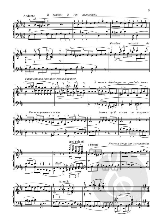 Auch wenn Satie sich bei seiner 'Sonatine' eng an klassische Formvorgaben anlehnte, handelt es sich doch um ein durch und durch ironisches Werk. Der Komponist, der sich in seinen späten Lebensjahren gern mit steifem Kragen und Bowlerhut auf der Straße sehen ließ, erzählt hier in Textzeilen zwischen den Notensystemen den Tagesablauf des typischen Pariser Büroangestellten, der mit grünseidenen Ärmelschonern im Sessel sitzt und von seiner Beförderung träumt. 'Nebenan spielt ein Klavier Clementi'... tatsächlich sind an dieser Stelle parodistische Anklänge an Clementis beliebte Sonatine op. 36/1 zu erkennen. Ulrich Krämer vermittelt im Vorwort zu unserer Ausgabe kenntnisreich die Hintergründe zum Verständnis von Saties Werk.