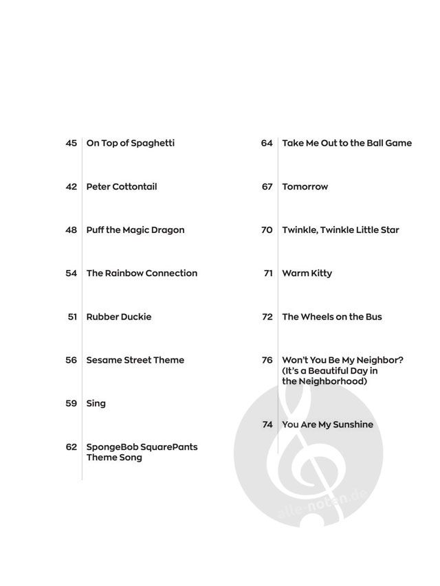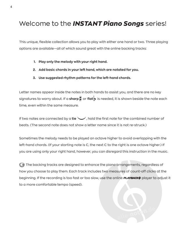 The Instant Piano Songs series will help you play your favorite songs quickly and easily - whether you use one hand or two! Start with the melody in your right hand, then add basic left-hand chords when you're ready. Letter namesinside each note speed up the learning process, and optional rhythm patterns take your playing to the next level. Online backing tracks are also included. Stream or download the tracks using the unique codes inside each book, thenplay along to build confidence and sound great! This edition includes 30 songs kids love to play and sing, including: Do-Re-Mi - Hakuna Matata - It's a Small World - On Top of Spaghetti - Puff the Magic Dragon - The RainbowConnection - SpongeBob SquarePants Theme Song - Take Me Out to the Ball Game - Tomorrow - The Wheels on the Bus - Won't You Be My Neighbor? (It's a Beautiful Day in the Neighborhood) - You Are My Sunshine - and more.