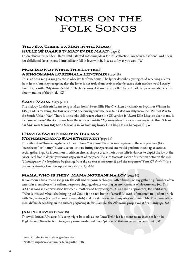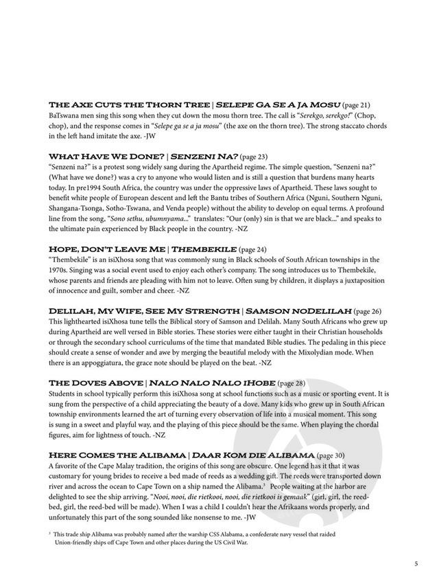 Mit diesen 24 Songs können Sie in die traditionelle Musik Südafrikas eintauchen. Während der Apartheid entwickelte sich die Musik der verschiedenen Kulturen und Gruppen des Landes (Afrikaans, amaNdebele, amaXhosa, amaZulu, Bapedi, Basotho, Batswana, Cape Malay, emaSwati, Vatsonga) ganz unterschiedlich. James Wilding, Nkululeko Zungu hielten es für längst überfällig, diese gegensätzlichen Musiktraditionen in diesem Spielband zusammenzuführen.