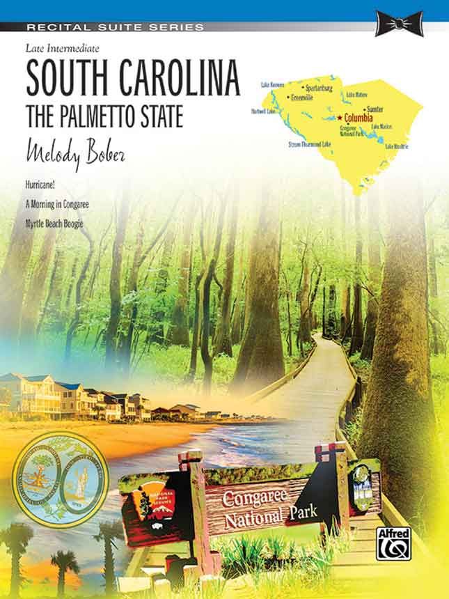 South Carolina: The Palmetto State displays this unique state in three exciting movements. 'Hurricane!' is intense, showing the energy of the natural disaster. It includes scales, octaves, full chords, written-out tremolos in the left hand, and dotted rhythms. A flowing middle section provides contrast. 'A Morning in Congaree,' in D major, is flowing and expressive, displaying the beauty found in the national park. Light syncopation creates a lilting feel, and a brief chordal section shows strength. 'Myrtle Beach Boogie' is full of excitement and swing rhythms. A boogie bass and bluesy melody include a variety of articulations and syncopation to produce an entertaining piece.