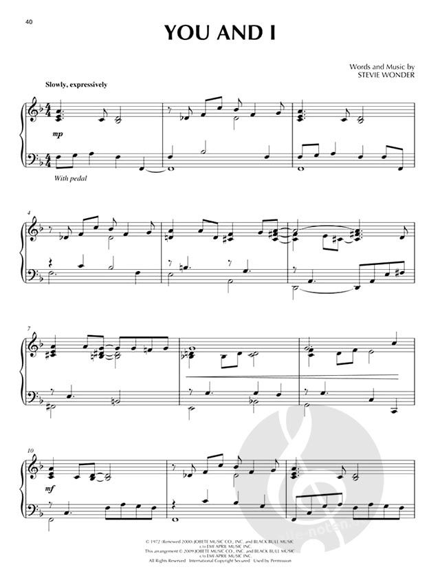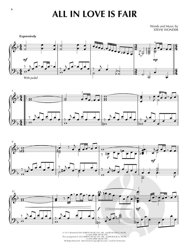 A dozen Stevie Wonder favorites expertly arranged for piano solo: All in Love Is Fair - Ebony and Ivory - I Just Called to Say I Love You - Isn't She Lovely - My Cherie Amour - Part Time Lover - Ribbon in the Sky - Sir Duke - Superstition - That Girl - You and I - You Are the Sunshine of My Life.