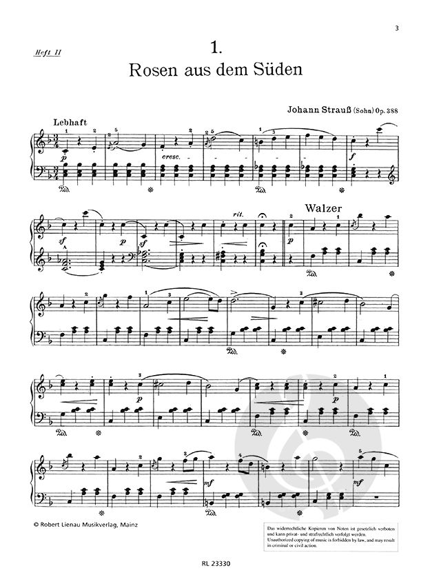 Walzer und Tanzmelodien von Strauß, Millöcker, Suppé, Zeller u.a., für Klavier leicht bearbeitet