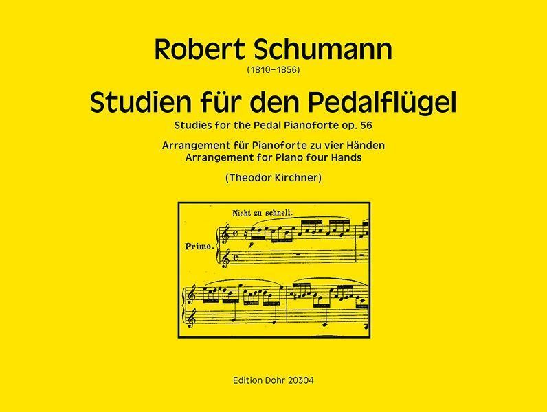 Um Kompositionen für Pedalflügel für die Praxis zu erhalten, mussten sie arrangiert werden. Insbesondere Schumanns Studien für den Pedalflügel op. 56 wurden seit jeher als besondere Juwelen erkannt und für verschiedene Besetzungen eingerichtet. Es gibt Bearbeitungen für Klavier zu vier Händen von Georges Bizet (1873), für zwei Klaviere zu vier Händen von Claude Debussy (1891), sowie die Nummern 2, 4, 5 und 6 für Klavier solo von Clara Schumann (1896; Neuausgabe in der Edition Dohr als E.D. 17629 in Vorb.). Von Theodor Kirchner existieren zwei Bearbeitungen aus dem Jahr 1888: eine für Klavier, Violine und Violoncello (Neuausgabe in der Edition Dohr als E.D. 18987) und die vorliegende Fassung für Klavier zu vier Händen. Theodor Kirchner hatte zeitlebens eine besonders enge Beziehung zu Schumanns Musik und hat zahlreiche Werke von ihm für Klavier bearbeitet, u.a. Liederzyklen, die Streichquartette und die vier Sinfonien. Auch der befreundete Johannes Brahms schätzte Kirchner als Bearbeiter seiner Werke. (Jürg Löffler)