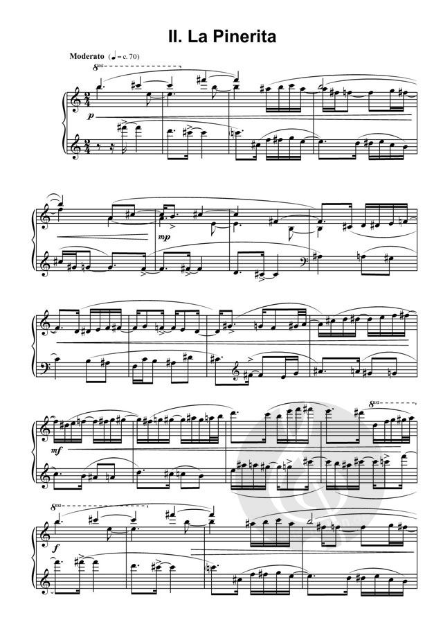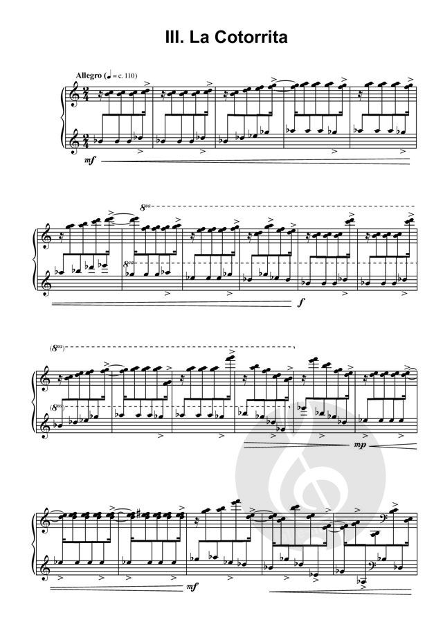 This suite consists of five characteristic pieces that evoke the island of La Juventud (Cuba), where the author spent her first years of life. These pieces are brief compositions inspired in the Cuban 'pianism' from the 19th century, from which Carvajal-Gómez makes an an inspired interpretation.