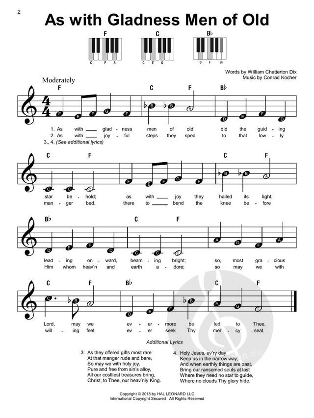 Playing piano is now super easy! This series features accessible arrangements for piano, with simple right-hand melody, letter names inside each note, basic left-hand chord diagrams, and no page turns! Perfect for beginning players of all ages. This Christmas volume provides simple piano arrangements for 30 Christmas favorites.