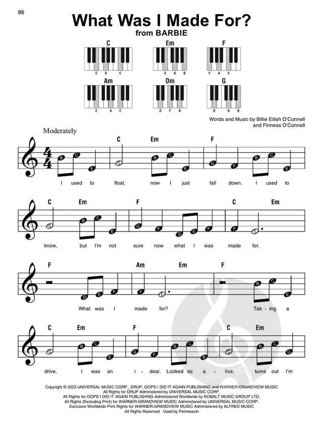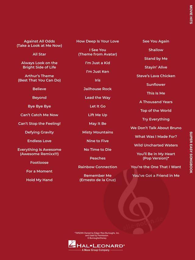 Erwecken Sie Ihre Lieblingsfilmmomente auf dem Klavier zum Leben mit Movie Hits - Super Easy Songbook! Diese Sammlung enthält 47 bekannte Songs aus einer Vielzahl beliebter Filme, die alle im Super Easy Piano Format von Hal Leonard arrangiert sind. Jedes Stück enthält einfache Melodien für die rechte Hand mit Buchstabennamen in den Notenköpfen, einfache Akkorddiagramme für die linke Hand und kein Umblättern, wodurch es ideal für Anfänger oder Gelegenheitsspieler ist. Die Songliste umfasst Jahrzehnte von Filmlieblingen, von gefühlvollen Balladen wie What Was I Made For? und A Thousand Years bis zu energiegeladenen Hits wie Footloose und Can't Stop the Feeling! Egal, ob Sie animierte Abenteuer, filmische Liebesgeschichten oder Pop-Hymnen aus dem Kino lieben, mit diesem Buch können Sie ganz einfach Musik aus den Filmen spielen, die Ihnen am besten gefallen.