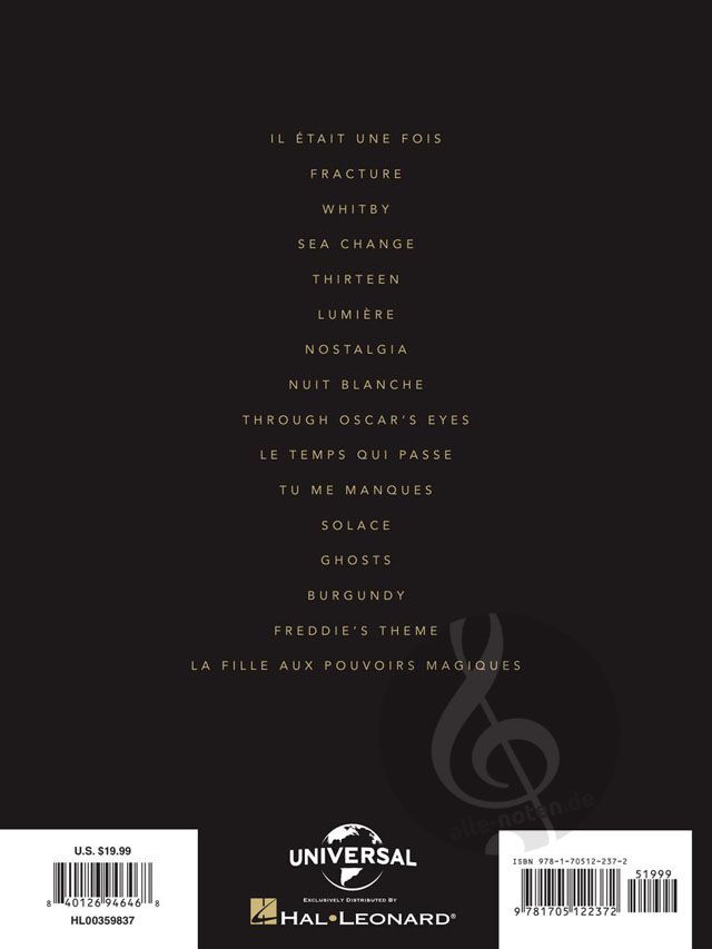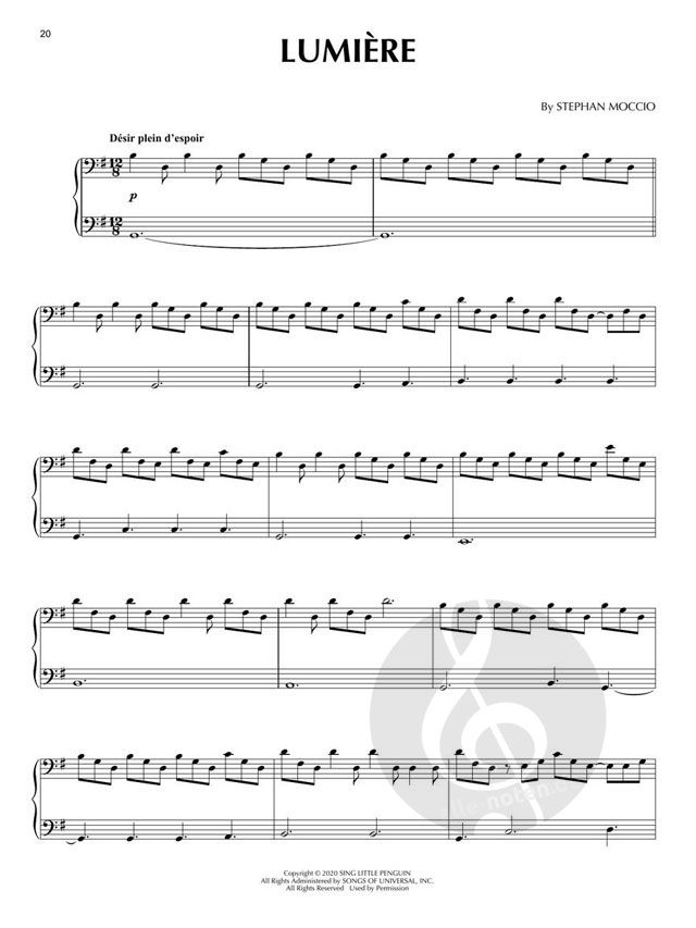 After writing chart-topping hits for the likes of Céline Dion, Avril Lavigne, Seal, and Josh Groban, multiple Grammy and Academy Award-nominated composer, songwriter, and producer Stephan Moccio released his debut album 'Tales of Solace' on Decca Records in 2020. It is a provocative album of melodic, tender piano meditations set to soothe the soul. Exploring some of life's more profound themes, his first single 'Fracture' was written in response to personal relationship struggles and the track 'Nostalgia' comtemplates aging through the eyes of a Hollywood starlet past her prime, her illustrious career behind her, and is drawn also from personal experience. 'Freddie's Theme' was inspired by the film 'Bohemian Rhapsody' and its tragic yet beautiful story of Freddie Mercury falling in love with a woman as a gay man. Our matching folio includes piano solo arrangements of all 16 works, including: Burgundy - Fracture - Freddie's Theme - Ghosts - Il était Une Fois - La Fille Aux Pouvoirs Magiques - Le Temps Qui Passe - Lumiére - Nostalgia - Nuit Blanche - Sea Change - Solace - Thirteen - Through Oscar's Eyes - Tu Me Manques - Whitby.