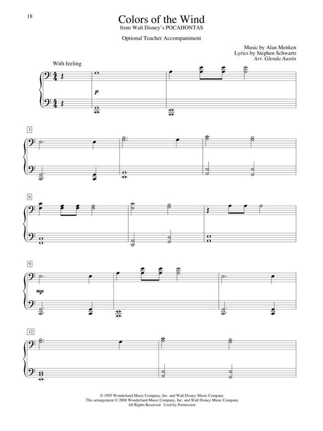 Your students will love playing these mid-elementary level supplements with fantastic optional teacher accompaniments arranged by Glenda Austin. They complement and enhance the original Teaching Little Fingers to Play method, offering important guides and reminders to reinforce musical concepts. Our Teaching Little Fingers series successfully encourages advancement and also provides delightful recital material! 9 songs, including: Circle of Life - Colors of the Wind - A Dream Is a Wish Your Heart Makes - A Spoonful of Sugar - Under the Sea - A Whole New World - and more.