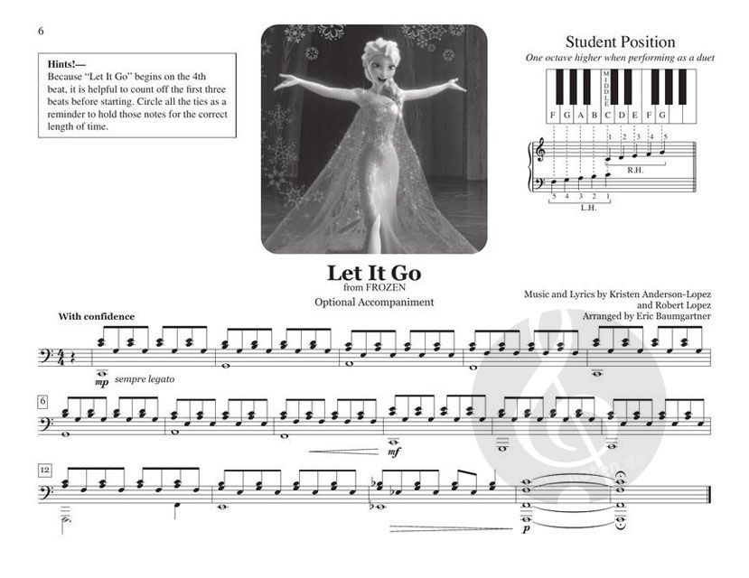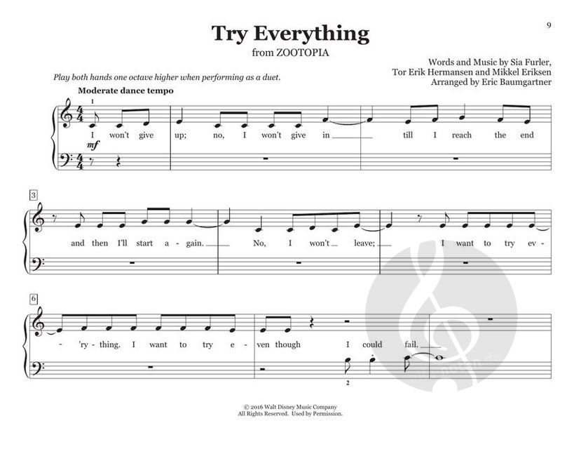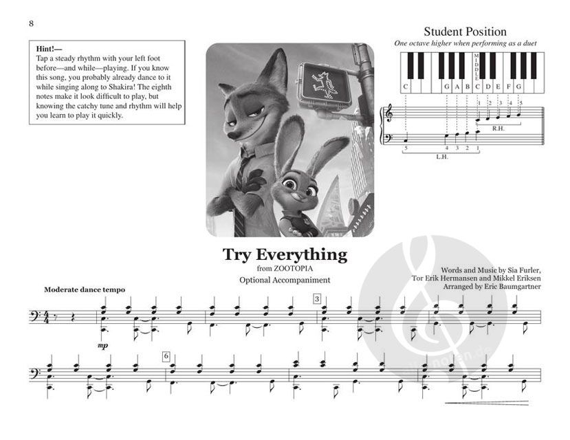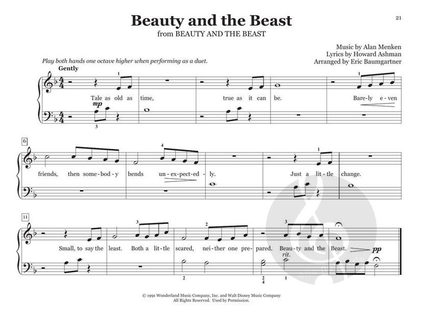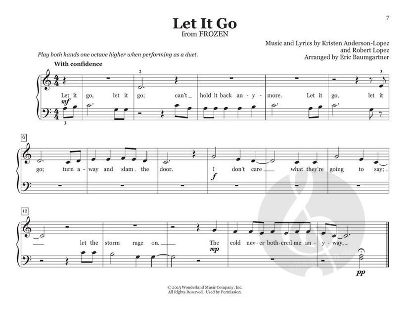 10 of the biggest Disney hits arranged for the youngest pianists among us! These great tunes are perfect to both sing and play and will make learning piano the most fun it has ever been. Illustrations included so everyone can remember their favorite part of the movie! Titles: Beauty and the Beast · Cruella de Vil · Heigh-Ho · How Far I'll Go · Let It Go · Remember Me (Lullaby) · Try Everything · Under the Sea · When Will My Life Begin? · When You Wish Upon a Star.