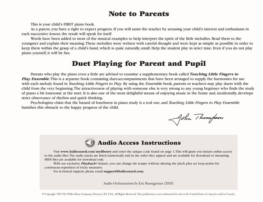 The classic, best-selling series for beginner pianists. Combining a rote and note approach, this book's delightful melodies are written as simply as possible, seamlessly integrating technique and music literacy. All the music lies within the grasp of the child's small hands. This revised edition includes online audio files orchestrated by Eric Baumgartner, giving pupils the opportunity to practise and perform each piece with a beautifully arranged backing track.