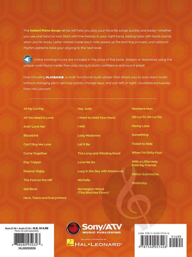 The Instant Piano Songs series will help you play your favorite songs quickly and easily - whether you use one hand or two! Start with the melody in your right hand, then add basic left-hand chords when you're ready. Letter names inside each note speed up the learning process, and optional rhythm patterns take your playing to the next level. Online backing tracks are also included. Stream or download the tracks using the unique codes inside each book, then play along to build confidence and sound great! This edition includes 30 Beatles favorites such as: Can't Buy Me Love - Come Together - Hey Jude - I Want to Hold Your Hand - Let It Be - Something - Yesterday - and more. Audio isaccessed online using the unique code inside the book and can be streamed or downloaded. The audio files include PLAYBACK+, a multi-functional audio player that allows you to slow down audio without changing pitch, set loop points, change keys, and pan left or right.