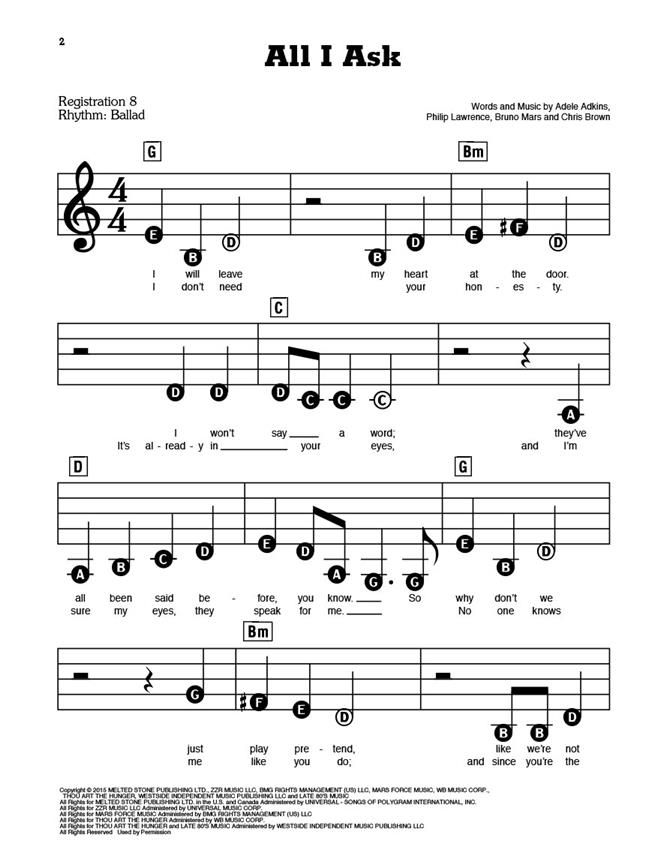 12 favorites from the British songbird in our famous E-Z Play Today notation: All I Ask - Chasing Pavements - Hello - Hometown Glory - Make You Feel My Love - Million Years Ago - Remedy - Rolling in the Deep - Set Fire to the Rain - Skyfall - Someone like You - When We Were Young.