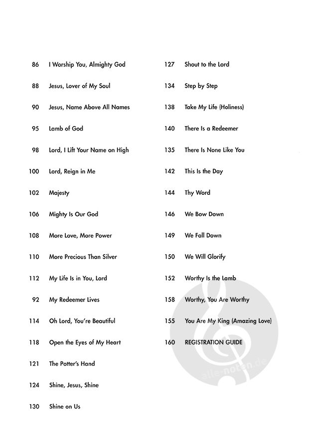 An amazing collection of 64 songs: Above All - Awesome God - Breathe - Come, Now Is the Time to Worship - Days of Elijah - Give Thanks - Here I Am to Worship - I Could Sing of Your Love Forever - Lord I Lift Your Name on High - Majesty - Open the Eyes of My Heart - Shine, Jesus, Shine - Shout to the Lord - We Bow Down - You Are My King (Amazing Love) - and many more.
