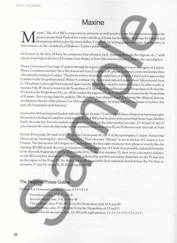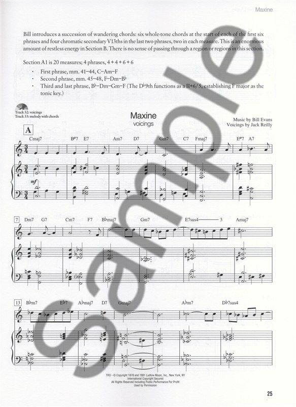 Bill Evans died in 1980 but the compositional legacy he left behind is forever expanding. In Reilly's second volume, he provides a deeper appreciation and understanding of Evans' compositions. It includes two important theory chapters, plus ten of Bill's most passionate and melodically gorgeous works. The voicing charts for all ten songs are more complex than volume one and pianistically more demanding, yet always worth the effort. The subjects of modulation and key relationships that are discussed in each chapter will help the player memorize faster and improvise with more facility; not an easy task when performing Evans' music. The 'Lament for Bill' in chapter 13 is the author's tribute to the genius of this great artist. The accompanying audio Online Audio will add to the enjoyment, understanding, and appreciation of the written examples. Songs include: For Nenette. January. Laurie. Maxine. Song for Helen. Turn Out the Stars. Very Early. Waltz for Debby. and more.