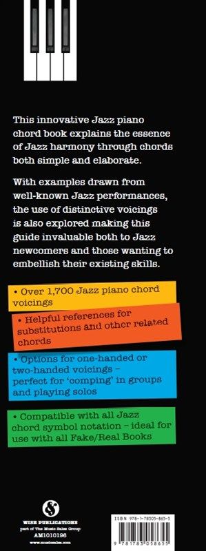 The Jazz Piano Chord Book, with over 1, 700 jazz Piano chord voicings contained within, is an essential resource for jazz Pianists, whether they're newcomers to the style or established players who want to improve upon existing skills. The handy and compact layout of this convenient Chord Book allows you to quickly and easily find the chord you are looking for. Its layout of the almost innumerable harmonic variations of each Piano chord, as well as the great reference system for substitutions and related chords, makes this book invaluable for any pianist looking to expand their harmonic horizons. It is not only a reference guide though, the lengthy introduction explores what jazz harmony is, how chord variations and voicings contribute to it, and how knowing them can enhance your playing incomparably. With sections for chords built from every root note, divided into major, minor, dominant, diminished and augmented, this book is not comprehensive but is as close to that as you can get. The infinite different ways of voicing each chord are condensed into the most popular and musically interesting, so you'll be able to use The Jazz Piano Chord Book to help you improvise with other musicians in an inventive way, or just to comp with other players competently. The Jazz Piano Chord Book is compatible with all jazz chord symbol notation, so you'll be able to use it to find any chord that you might need to play with ease. With its compact size and durable design, it will slip easily into any case, crucially allowing you to take it with you wherever you go, so you'll never be caught short without that chord again! For a complete and authoritative reference guide to injecting some vitality and beauty into your Piano playing, you should never be going anywhere without The Jazz Piano Chord Book, an essential list of chords for any aspiring pianist, whatever your ability.