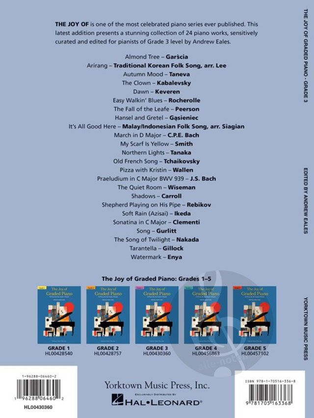 THE JOY OF ist eine der bekanntesten Klavierserien, die jemals veröffentlicht wurde. Diese neueste Ausgabe enthält eine beeindruckende Sammlung von 24 Klavierwerken für Klavier solo mit Hintergrundinformationen und Übungstipps, die von Andrew Eales mit viel Feingefühl für Pianisten der Klasse 3 zusammengestellt und bearbeitet wurden. Dazu gehören Klassiker vom Barock bis zur Romantik und zeitgenössische Meisterwerke aus aller Welt.