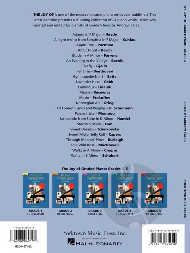THE JOY OF ist eine der bekanntesten Klavierserien, die jemals veröffentlicht wurde. Diese neueste Ausgabe enthält eine beeindruckende Sammlung von 24 Klavierwerken für Klavier solo mit Hintergrundinformationen und Übungstipps, die von Andrew Eales mit viel Feingefühl für Pianisten der Klasse 5 zusammengestellt und bearbeitet wurden. Dazu gehören Klassiker vom Barock bis zur Romantik und zeitgenössische Meisterwerke aus aller Welt.