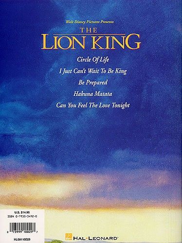 8 vocal selections from the Disney blockbuster: Be Prepared - Can You Feel the Love Tonight - Circle of Life - Hakuna Matata - I Just Can't Wait to Be King. Includes both film versions and Elton John solo versions of the songs. P/V/G and Easy Piano editions are filled with beautiful full-color scenes from the film.