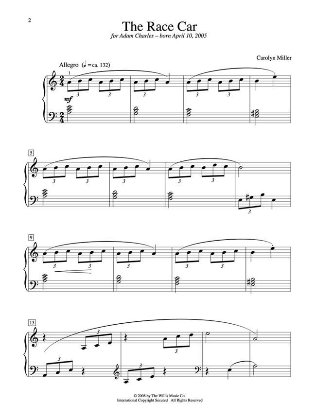 Students eager to play a fast show-offy song will delight in playing Carolyn Miller's The Race Car. This A-minor piece sounds hard, yet fits perfectly in small hands and includes repeated triplet patterns throughout. Zooms appropriately to an exciting ending.