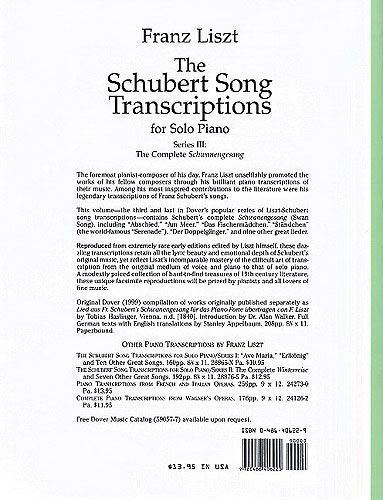 The foremost pianist-composer of his day, Franz Liszt unselfishly promoted the works of his fellow composers through his brilliant piano transcriptions of their music. Among his most inspired contributions to the literature were his legendary transcriptions of Franz Schubert's songs. This volume, the third in the series, contains Schubert's complete Schwanengesang, and nine other great lieder.