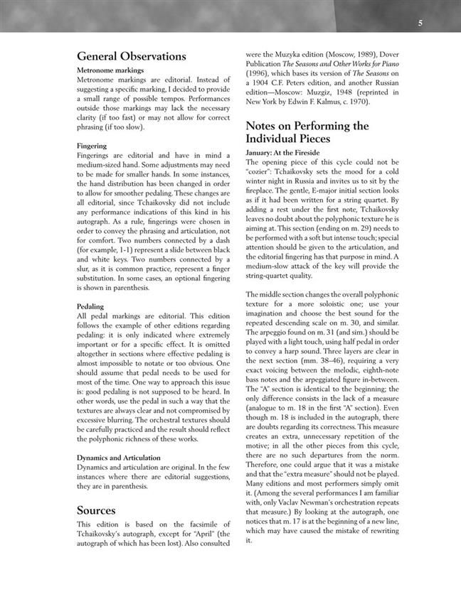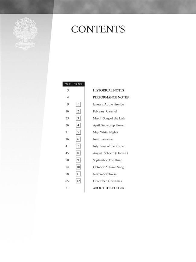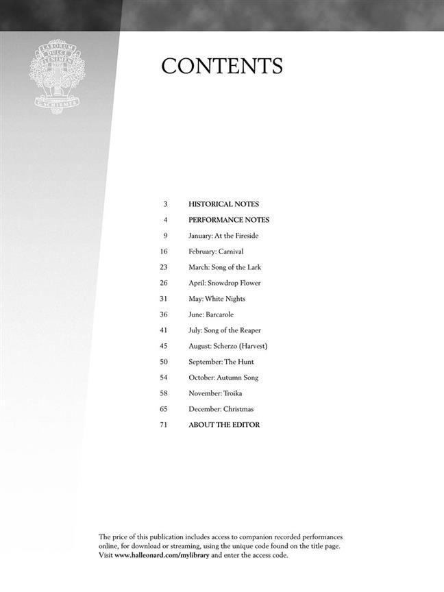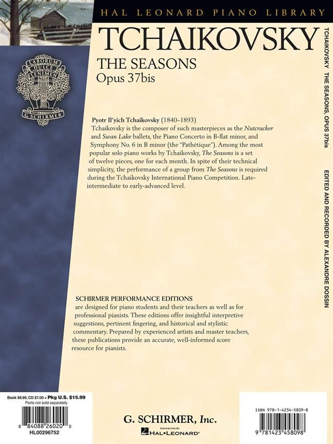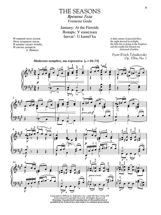 The Seasons is a set of twelve pieces, one for each month. In spite of their technical simplicity, the performance of a group from The Seasons is required at the Tchaikovsky International Piano Competition. Late Intermediate to Early Advanced Level.