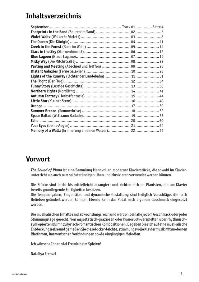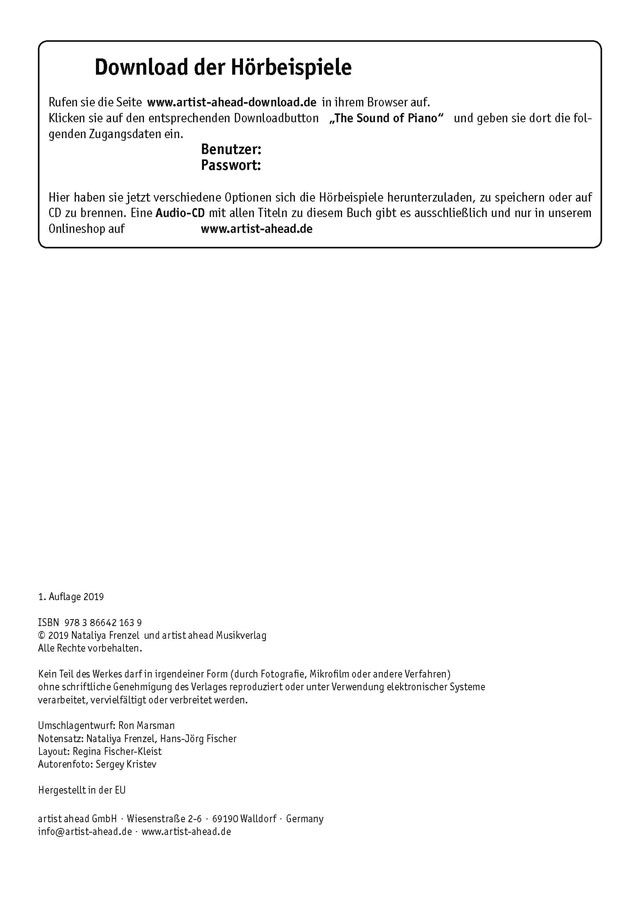 Unter artist-ahead-download.de stehen die enthaltenen Klavierstücke als Audio- und MP3-Dateien zum Download zur Verfügung. Eine Audio-CD mit allen Titeln zu diesem Buch ist in unserem Onlineshop unter artist-ahead.de erhältlich.