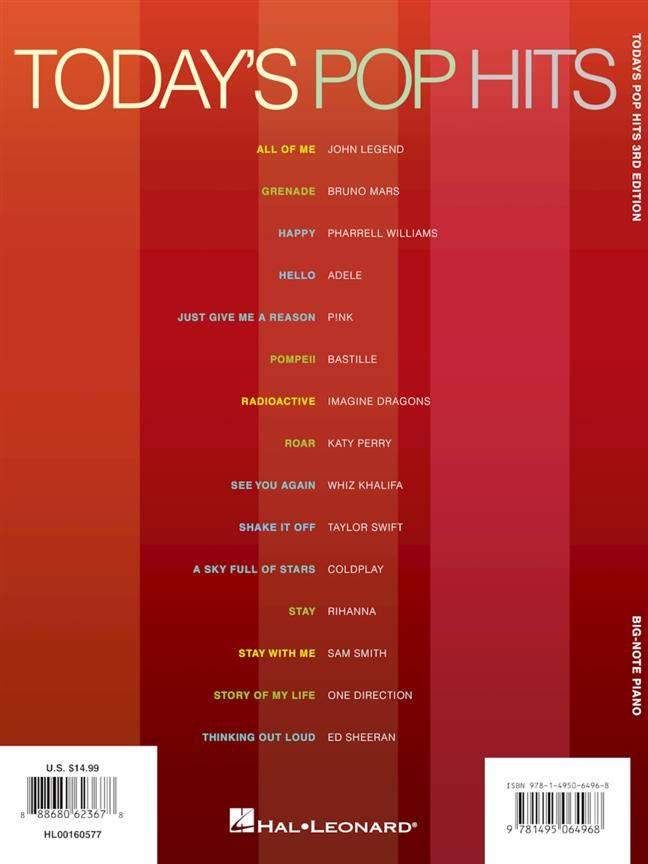 A great collection of current pop hits that even developing piano players will be able to enjoy. 15 songs with lyrics, including: All of Me / Happy / Hello / Pompeii / Radioactive / Roar / Shake It Off / Stay with Me / Story of My Life / and more.