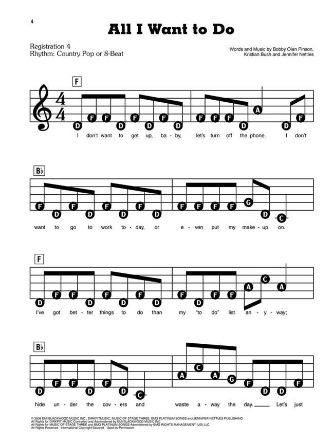 25 contemporary country classics arranged in our famous E-Z Play Today notation, including: All I Want to Do - Amazed - Before He Cheats - Cruise - Follow Your Arrow - I Hope You Dance - I Knew You Were Trouble. - If I Die Young - Need You Now - Stuck like Glue - Summertime - Wagon Wheel - and more.