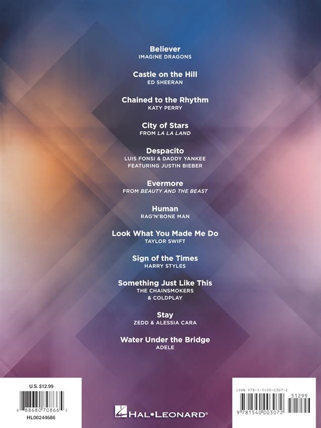 12 of 2017's top hits piano players of all skill levels can enjoy. Songs included: Believer - Castle on the Hill - Chained to the Rhythm - City of Stars - Despacito - Evermore - Human - Look What You Made Me Do - Sign of the Times - Something Just Like This - Stay - Water Under the Bridge.