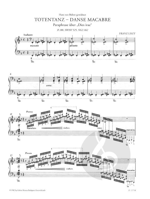 Throughout his life, Liszt's imagination was almost obsessed with notions of death and mourning. He composed many works on these topics, such as Pensée des morts, Funérailles, the two versions of La lugubre gondola, and Totentanz (Dance of Death), based on the Gregorian Dies irae sequence depicting the horrors of the Last Judgement. The latter project matured over a period of several decades, beginning in 1830, when Liszt heard the premiere of Berlioz's Symphonie fantastique, whose finale includes the Dies irae theme. Along with this musical impression, Liszt was stirred by horrifying visual representations of the dance of death by Holbein and Buffalmacco. Totentanz, composed asa series of variations, was finally completed during Liszt's Weimar period as one of its most outstanding compositions. Totentanz, composed as a series of variations, was finally completed during Liszt s Weimar period as one of its most outstanding compositions. Of the three versions for piano solo, two pianos, and piano and orchestra, this edition contains the two-hand piano solo version. This revised (2018) version is based on the New Liszt Edition, and provides a revised score, a facsimile reproduction, and critical notes. The new editorial preface orientates the reader in all the major questions regarding the work's genesis.
