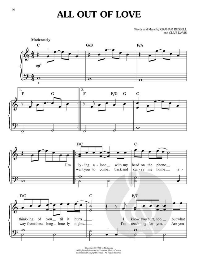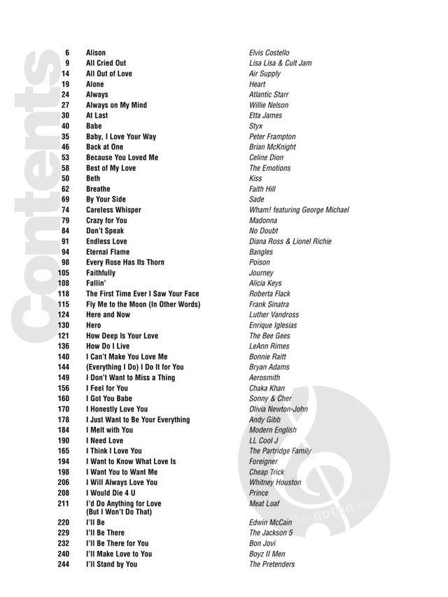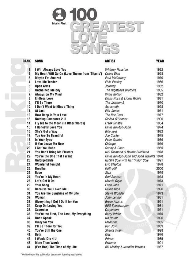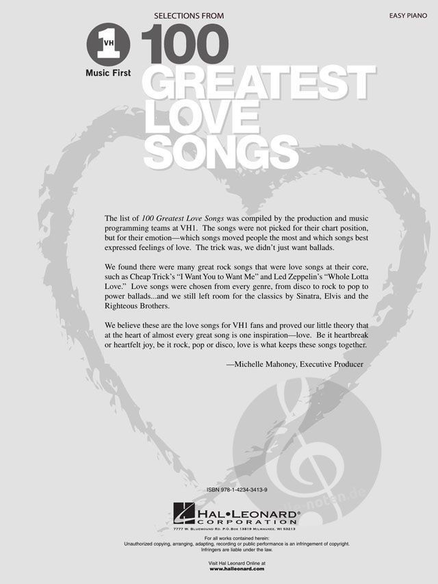 The very best love songs from all genres chosen by VH1 and ranked 1-100. Includes easy arrangements of: I Will Always Love You - My Heart Will Go On - Maybe I'm Amazed - Love Me Tender - Open Arms - Unchained Melody - and dozens more, plus info on the selection process. 480 pages of great music!