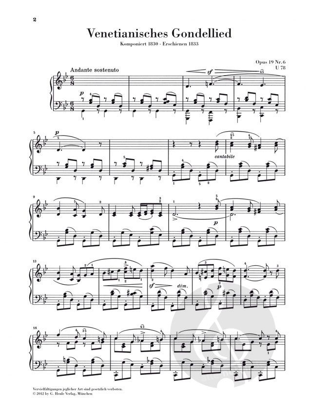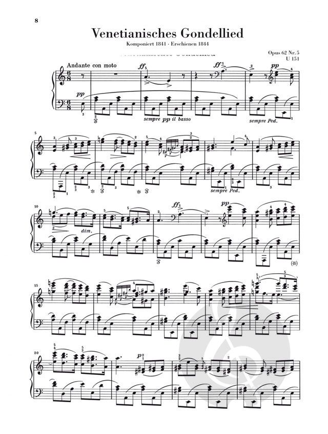 Im Herbst 1830 besuchte Mendelssohn Bartholdy im Rahmen einer großen Europareise Venedig. Die Eindrücke berauschten ihn. Über die ortstypischen Gondelfahrer weiß er zu berichten: 'Jetzt schreien eben wieder die Gondoliere einander an, und die Lichter spiegeln sich weit ins Wasser hinein; einer spielt Gitarre und singt dazu. Es ist eine lustige Nacht'. Möglicherweise in Erinnerung an seinen Aufenthalt schrieb Mendelssohn zwischen 1830 und 1841 vier Venetianische Gondellieder (im Henle Urtext in den Sammelbänden HN327 und 861 erschienen). Wir präsentieren die vier beliebten, leicht spielbaren und melodienseligen Stücke zusammengefasst in einer Ausgabe, ergänzt durch ein neues Vorwort von Ullrich Scheideler.