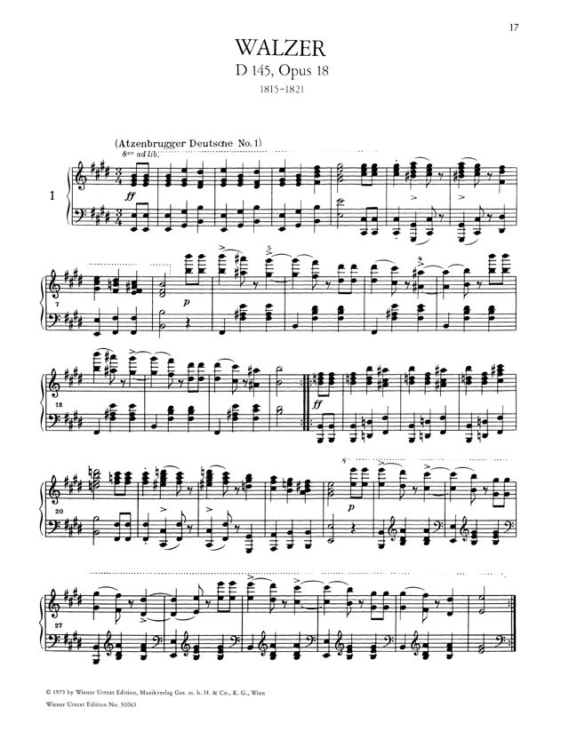Haydn, Mozart und Beethoven schrieben Tanzmusik zumeist als Auftrag für Hof und Adel. Schubert war in der sozialen Stufe des heraufkommenden Bürgertums angesiedelt. Seine Tanzmusik entfloss keinem finanzträchtigen Auftrag, höchstens dem, seinen Freunden und seiner Gesellschaft gelegentlich Freude zu bereiten. Sie entstammt einer Zeit, die in Kunstmusik und Unterhaltungsmusik noch keinen Gegensatz erblickte; und wie viele seiner Lieder bei all ihrer hohen Kunst volkstümlich wurden, so verleugnet keiner seiner Tänze echte Wiener und österreichische Folklore. Die beiden vorliegenden Bände (Walzer und Deutsche Tänze UT 50063 / Ländler, Ecossaisen, Menuette UT 50064) enthalten die schönsten und populärsten Tänze, ausgewählt aus dem mehr als doppelt so umfangreichen Gesamt-Oeuvre dieser liebenswerten Schubertschen Gattung. Die zu Schuberts Zeit oder kurz danach veröffentlichten Tänze (wie beispielsweise Erster Walzer, Letzte Walzer, Wiener Damen-Ländler oder 20 Menuette usw.) sind in ihrem Zusammenhang belassen, von den kleineren Gruppen und Einzelstücken sind die schönsten in diese beiden Auswahlbände aufgenommen worden. Beide Bände enthalten Vorwort und Kritische Anmerkungen. Über wissenschaftliche Belange und die Probleme in bibliographischer Hinsicht, welche auch die zahlreichen Bearbeitungen einbeziehen, gibt der in Sämtliche Tänze für Klavier (UT 50021 /22) veröffentlichte Quellenbericht einen lückenlosen Überblick.