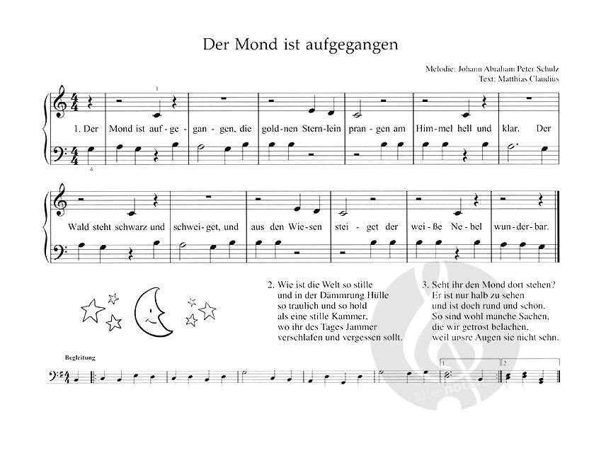 Von 'Der Mond ist aufgegangen', 'Der Sandmann ist da', 'Guter Mond, du gehst so stille', 'Hört, ihr Herrn, und lasst euch sagen' über 'Müde bin ich, geh zur Ruh', 'Die Blümelein, sie schlafen' und 'Sandmann, lieber Sandmann' bis 'Weißt du, wie viel Sternlein stehen' und 'Wer hat die schönsten Schäfchen'. Die Bearbeitungen aller Lieder bewegen sich im Fünftonraum. Zusätzlich gibt es zu jedem Stück eine Begleitstimme.