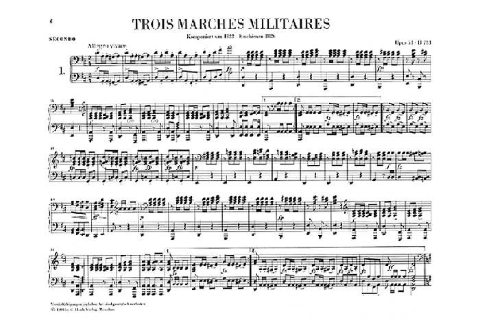 Kein anderer großer Komponist hat so viele Werke für Klavier zu vier Händen hinterlassen wie Franz Schubert - insgesamt 54 (davon 32 mit Opus-Zahl): Fantasien, Tänze, Märsche, Variationen, Rondos, Sonaten usw. Gemeinsames Musizieren, häufig in geselligem Kreis, war ein fester Bestandteil des Schubert'schen Freundeskreises. Wie viel Freude bereitet es, sich mit diesen Stücken zu befassen! In den drei Henle-Urtextbänden mit Schuberts vierhändiger Klaviermusik sind sie chronologisch angeordnet. Band II enthält insgesamt 26 Stücke, 19 davon in vier Opera mit drei, vier und sechs Einzel-stücken zusammengefasst: Trois Marches militaires, Vier Ländler sowie jeweils sechs Grandes Marches et Trios und Polonaisen. Sie stammen aus den Jahren 1818 bis 1826. Am bekanntes-ten aus diesem Band ist wohl die auch als Grand Duo bezeichnete C-dur-Sonate D 812 aus dem Jahr 1824. Aber - ohne die anderen Stücke hintanstellen zu wollen - auch die sieben ent-haltenen Märsche sind prachtvolle Kompositionen.