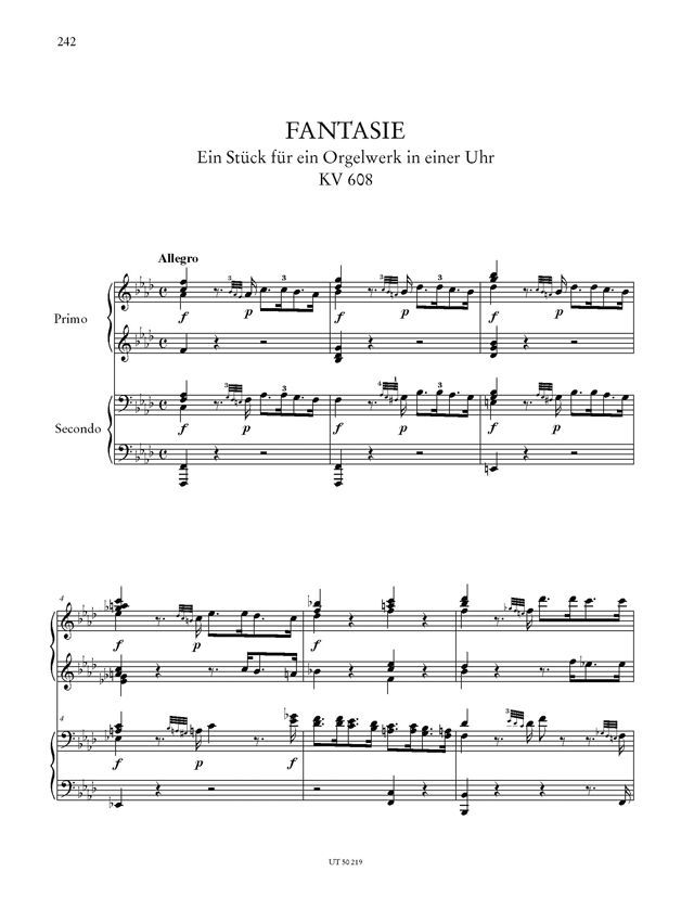 Mozarts Werke für Klavier zu vier Händen bilden einen ersten Höhepunkt der Gattung, der wohl nur von Franz Schubert wieder erreicht wird. Den zwei frühen Sonaten aus der Salzburger Zeit, die sich für den Unterricht der Mittelstufe besonders eignen, stehen drei wirkungsvolle Kompositionen der Wiener Zeit gegenüber. Der Band enthält ausserdem die in ihrer Echtheit nicht sicher verbürgte Sonate KV 19d sowie zwei fragmentarische Sätze aus Mozarts letzten Lebensjahren KV 357. Der renommierte amerikanische Pianist und Mozart-Kenner Robert D. Levin hat diese - ausgehend von den erst seit wenigen Jahren wieder zugänglichen autographen Fragmenten - stilgerecht für die Praxis vervollständigt und dabei im Gegensatz zum Erstdruck von ca. 1860 die Tastaturbegrenzungen der Mozart-Klaviere und den Personalstil des Komponisten berücksichtigt. Im Anhang finden sich die beiden ursprünglich für mechanische Orgelwerke bestimmten Fantasien KV 594 und 608 nach den frühesten, bereits wenige Jahre nach Mozarts Tod erschienen vierhändigen Arrangements.