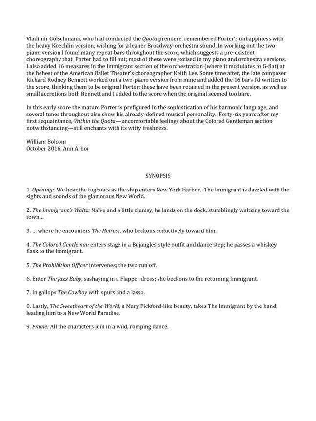 Cole Porter's only attempt at a serious composition came with the ballet score Within the Quota, when Darius Milhaud suggested Porter as a composer to pair with his La Création du monde. Both pieces were rapturously received by the Parisian press at the October 1923 premiere at the Théâtre des Champs-Élysées. Cole Porter later believed the score to be lost. In 1970 the score was discovered at Yale, from which William Bolcom and Richard Rodney Bennett created this two-piano version. The ballet is about an immigrant to New York who encounters a seductive heiress, a tap-dancer, a flapper, a cowboy, and a movie star beauty. Two copies needed for performance.