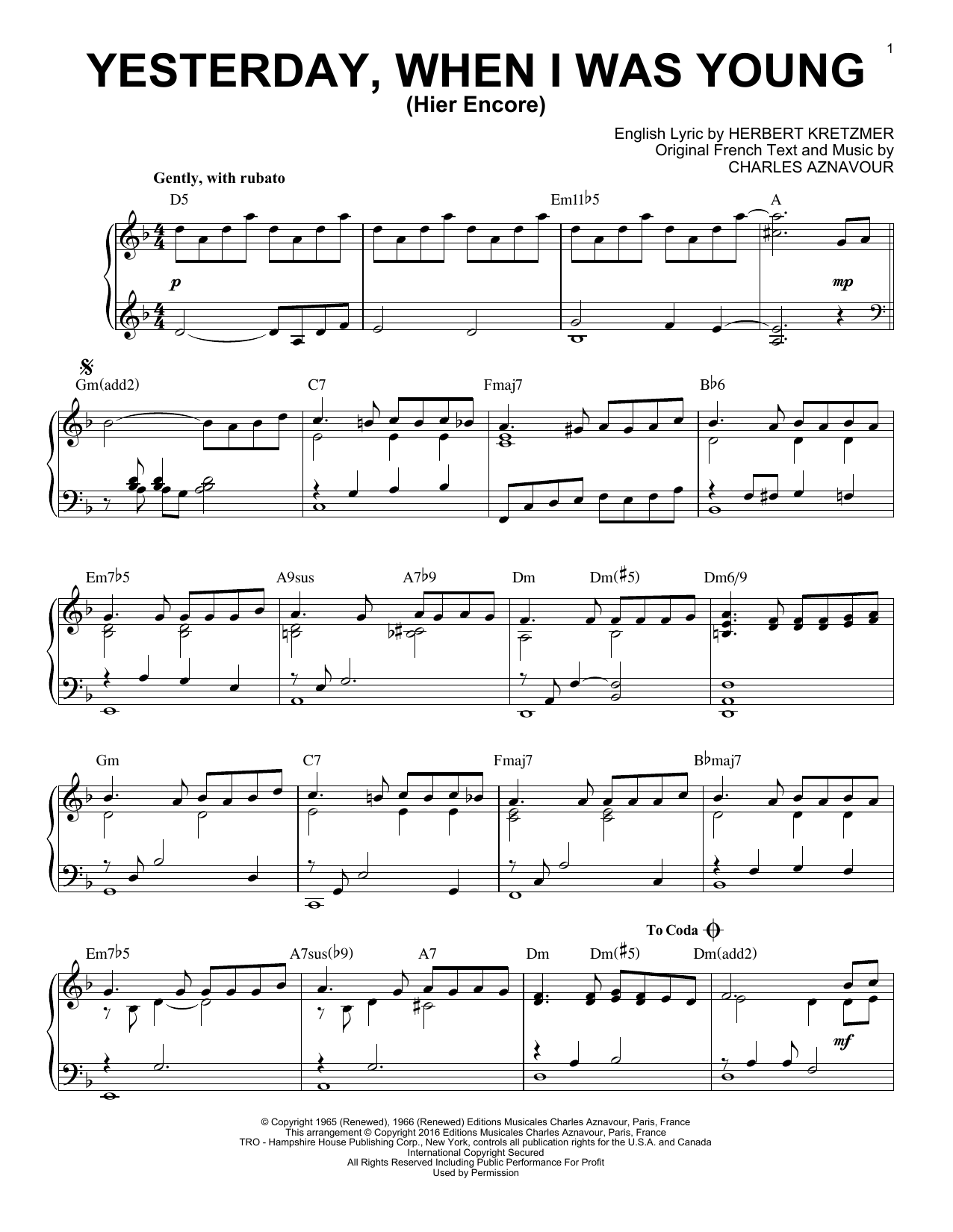 Yesterday, When I Was Young (Hier Encore) [Jazz version]